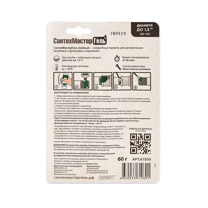 Анаэробный клей-герметик Сантехмастергель до 1 1/2" зеленый, 60 гр в Нефтекамске