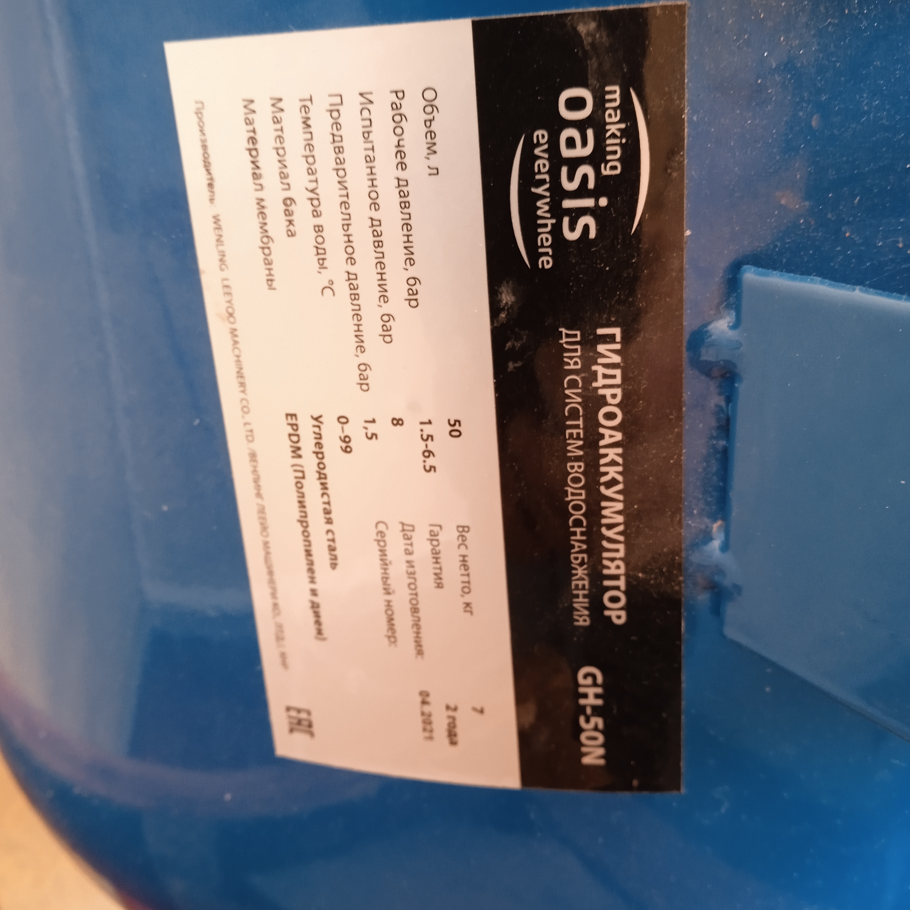 Гидроаккумулятор Oasis, 8 бар, 50 л, горизонтальный, синий