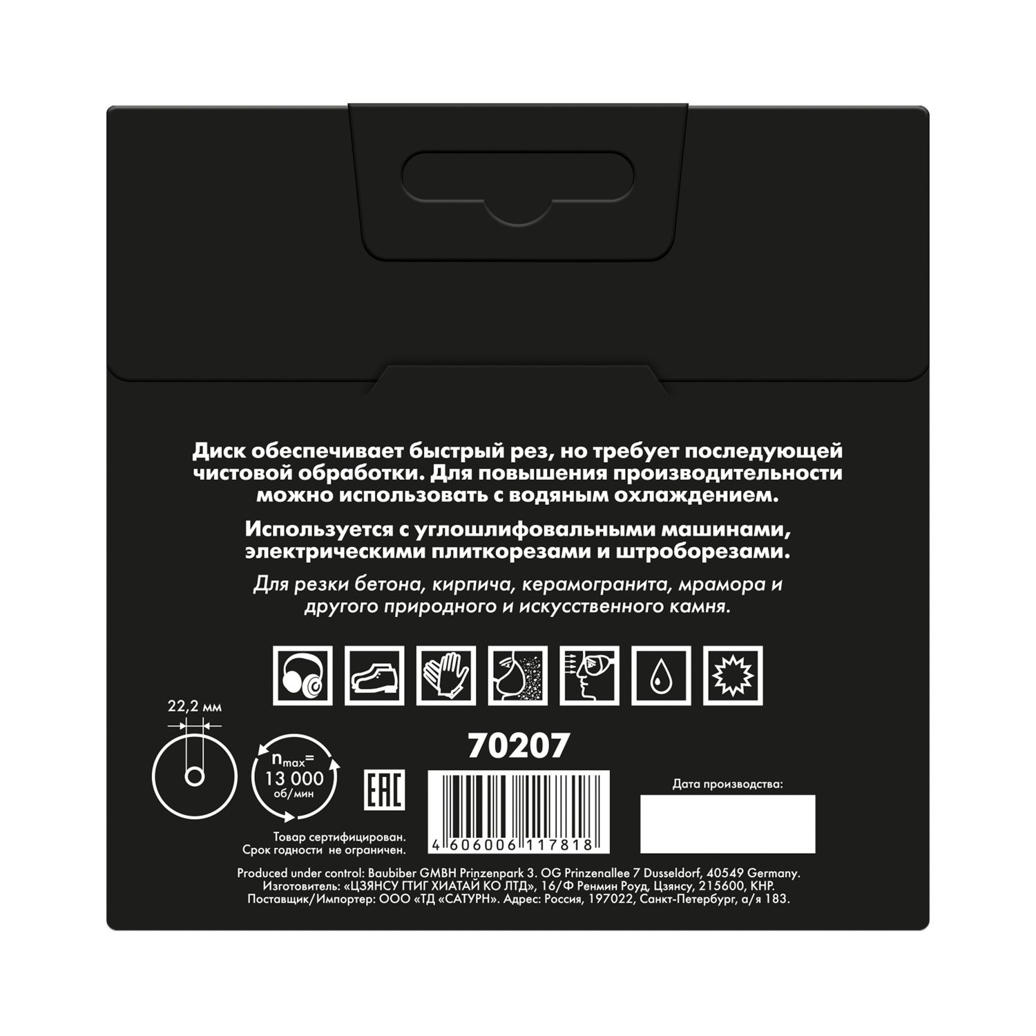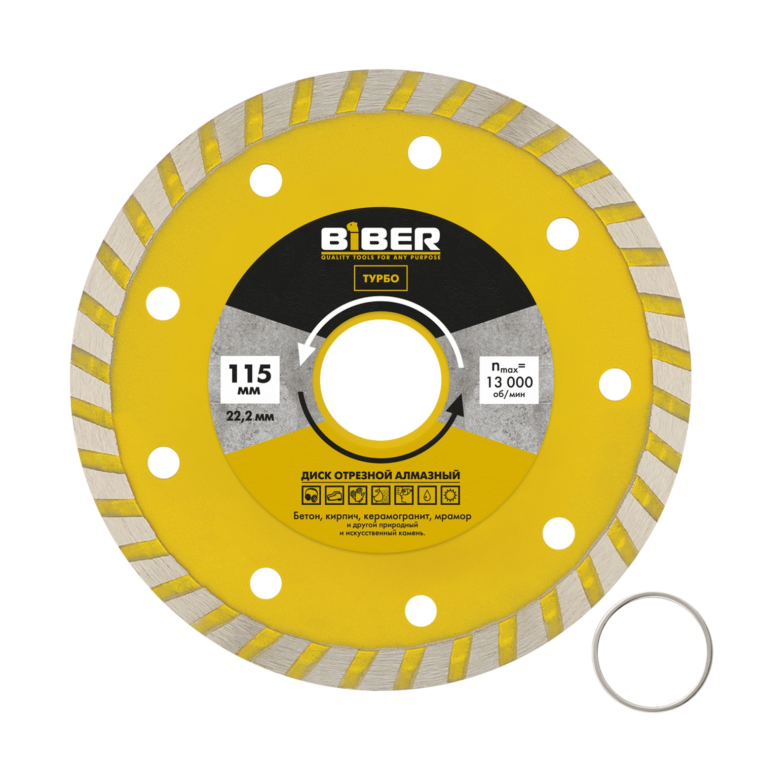 Алмазный диск Biber турбо предназначен для резки бетона, кирпича, керамогранита, мрамора и другого природного и искусственного камня. Используется с углошлифовальными машинами и штроборезами.