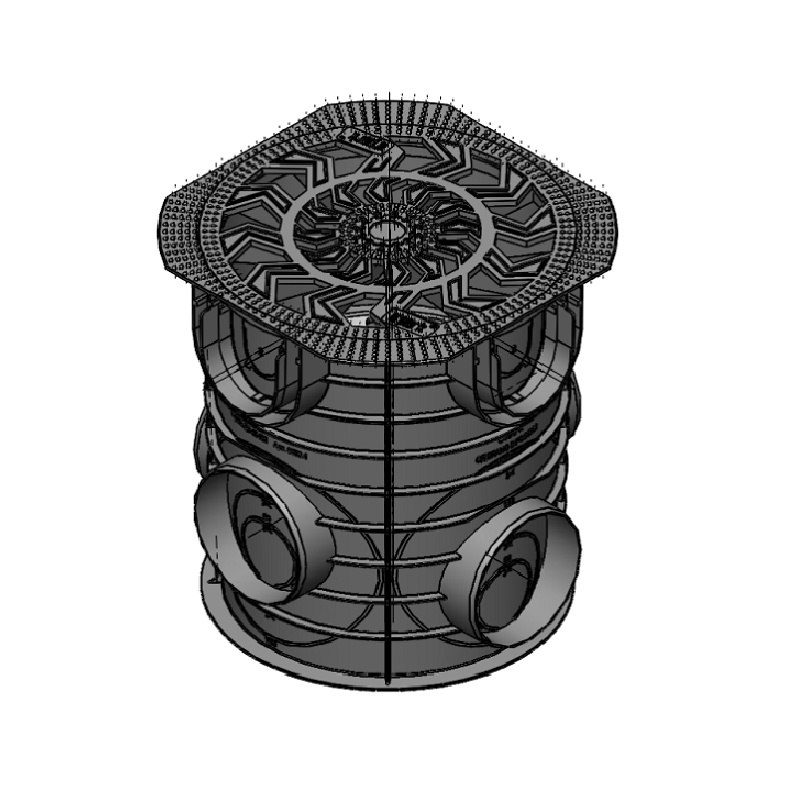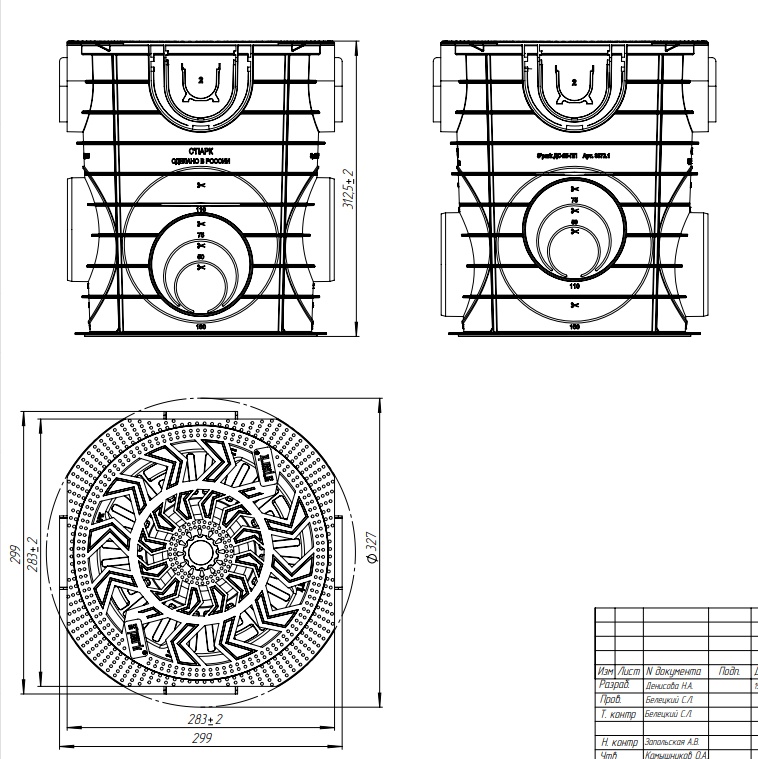 Поставляется в сборе с круглой пластиковой решеткой. Внутри дождеприемника находится корзина для сбора мусора, который смывается ливневыми водами. Дождеприемник имеет фланцы для соединения с канализационными трубами для отведения собранных вод из дождеприемника в канализационную систему. Также к дождеприемнику можно подключать водоотводные лотки с сечением DN100. Для этого с каждой стороны дождеприемника имеются фланцы соединения с лотками.