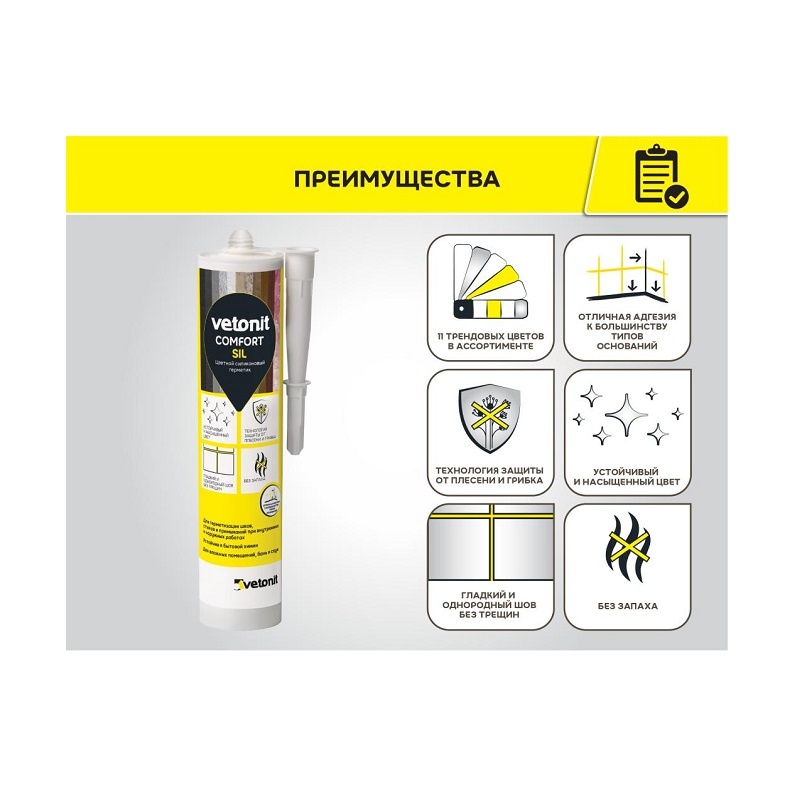 Важно! Герметик Vetonit Comfort Sil обладает усиленным противогрибковым действием, содержит фунгицид, поэтому не подходит для герметизации аквариумов.