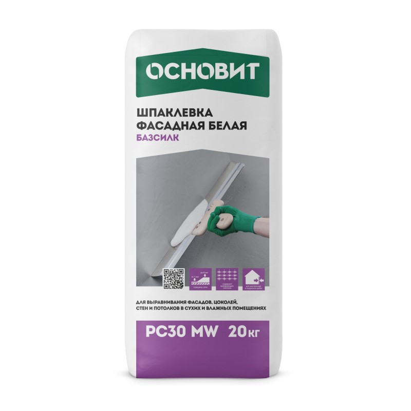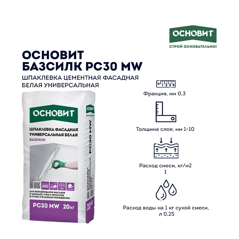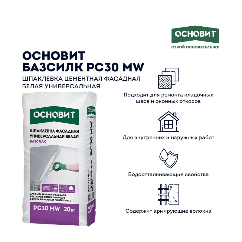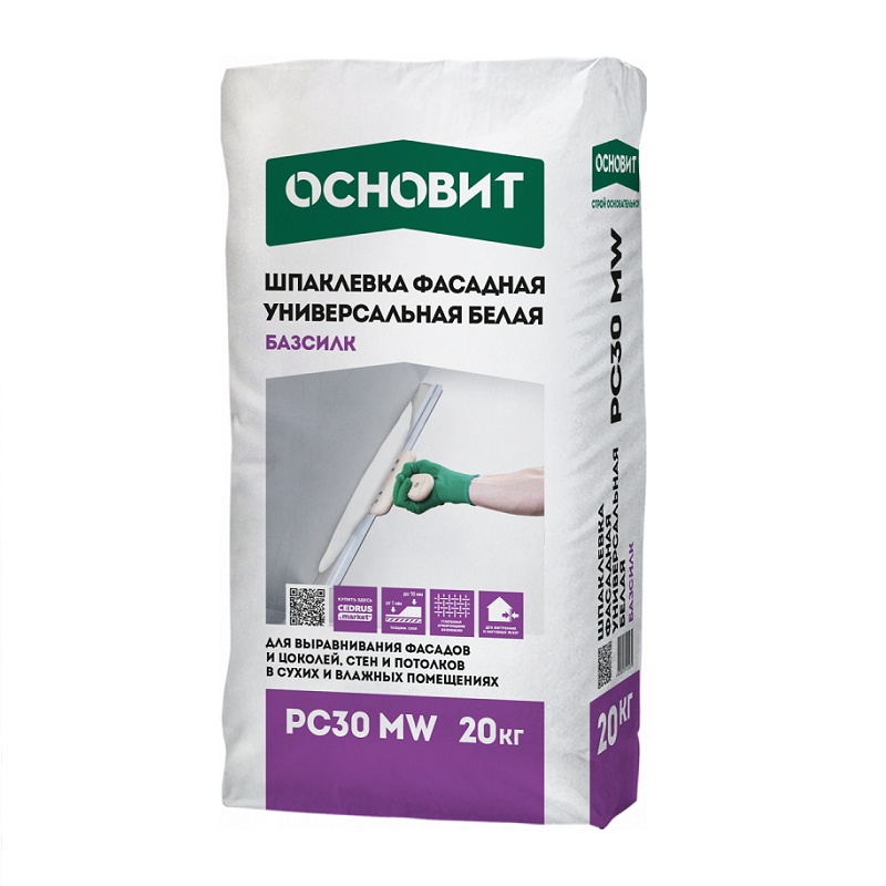 Шпаклевка цементная фасадная Основит Базсилк PC30 MW белая, 20 кг