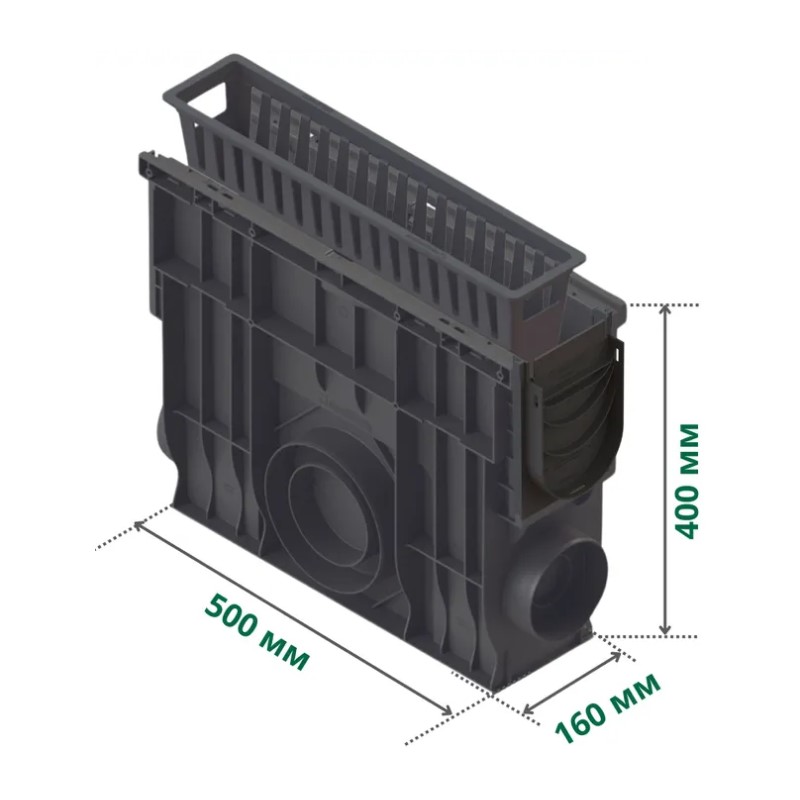 Предназначен для установки в конце водоотводной системы лотков для предварительной грубой очистки собранных ливневых и талых вод перед выпуском в канализацию. Поставляется в сборе с заглушками. Имеет выходы для подсоединения канализационной трубы d=110 и 160 мм. Пескоуловитель укомплектован корзиной для сбора мусора. Комплектуется чугунной, стальной или пластиковой решеткой для водоотведных лотков с гидравлическим сечением DN100.