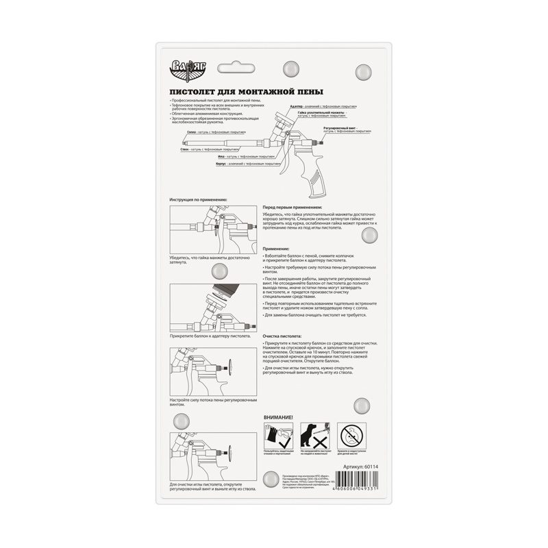 В строительном магазине Сатурн можно купить товар "Пистолет для монтажной пены Варяг 60114 с тефлоновым покрытием" по цене от 2503 руб с доставкой за 2 часа по Нефтекамску или оформить самовывоз.