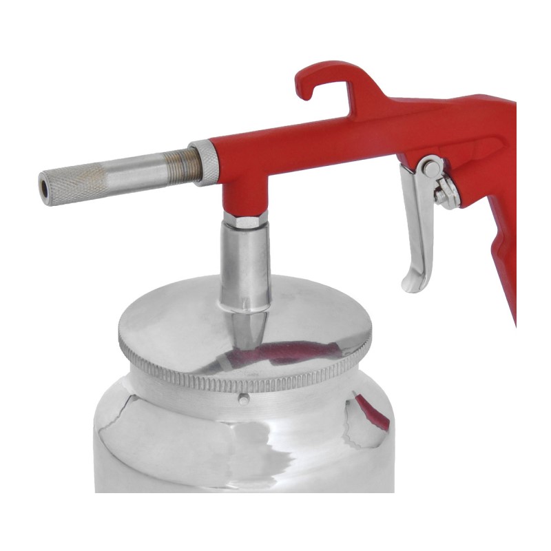Предназначен для очистки поверхности металлических деталей от ржавчины, краски, продуктов сгорания и других загрязнений с помощью струи сжатого воздуха с мелкодисперсным абразивным песком. Для работы пескоструйного пневмопистолета необходимо использовать воздушный компрессор с производительностью на выходе не менее 140 л/мин. Металлический нижний бачок, объемом 0,75 литра.
