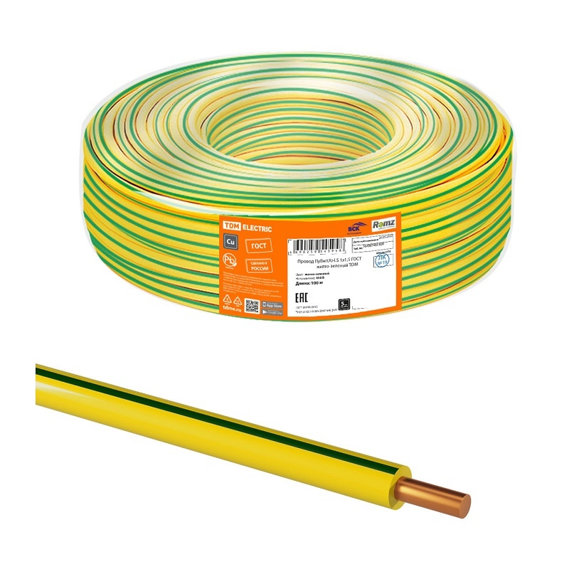 Провод ПуВнг-LS (ПВ-1) 1х1,5мм2, желто-зеленый (1 п.м.) ГОСТ 31947-2012