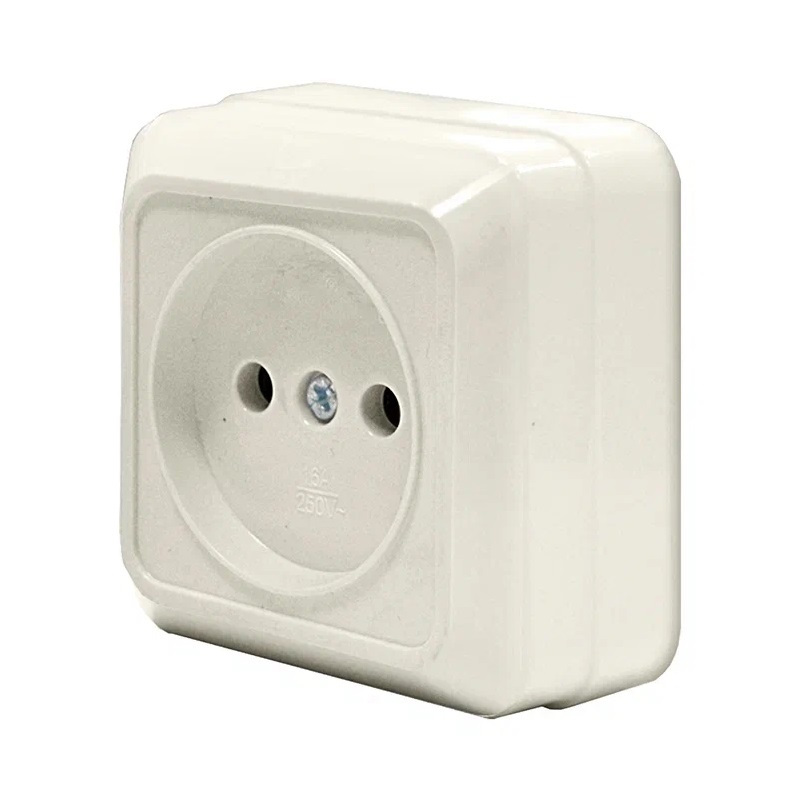 Розетка одноместная без заземления открытой установки серии, 1 гнездо, слоновая кость предназначена для установки в помещениях с открытой проводкой (ремонт, складские и подсобные помещения, временные коммуникации, нежилые помещения и места, где заземление не требуется). Подходит для быстрой замены и монтажа в бытовых и коммерческих сетях переменного тока.