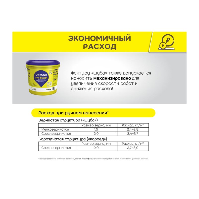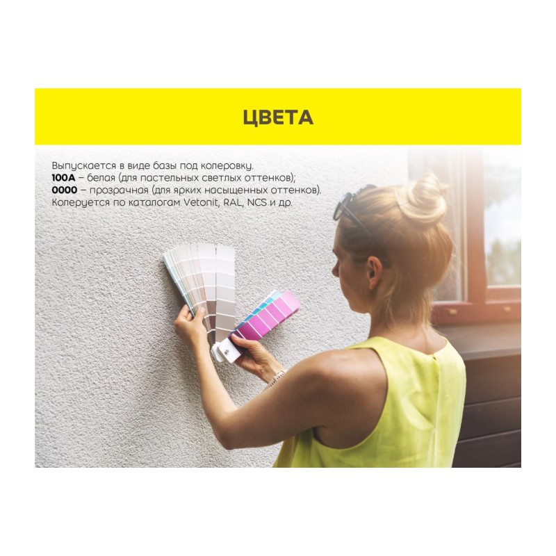 Vetonit Pas Akrylat - акриловая декоративная штукатурка для создания декоративно-защитного финишного слоя на поверхности фасада с минеральной ватой (базальтовой и кварцевой), а также пенополистиролом. Представлена в фактурах шуба и короед с размером зерна от 1,5 до 2 мм. Штукатурка Ветонит Пас Акрилат не требует последующей окраски, так как колеруется в массе в соответствии в соответствии с цветовой палитрой Vetonit Color Spectrum, RAL, NCS и другими системами. При использовании в системах с минеральной ватой (базальтовой и кварцевой) требуется произвести расчет на влагонакопление.