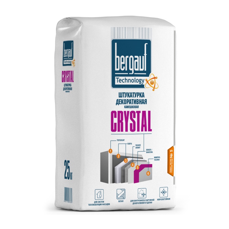 Морозостойкая декоративная камешковая штукатурка Бергауф Кристал применяется для декоративной отделки и придания рельефа минеральным поверхностям таким, как бетон, цементные и гипсовые штукатурки, кирпич, поверхности, ранее окрашенные воднодисперсионными красками.
