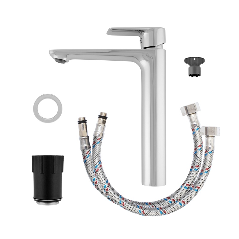 Комплектация: смеситель, гибкая подводка, комплект крепежа, ключ для снятия аэратора, паспорт изделия.