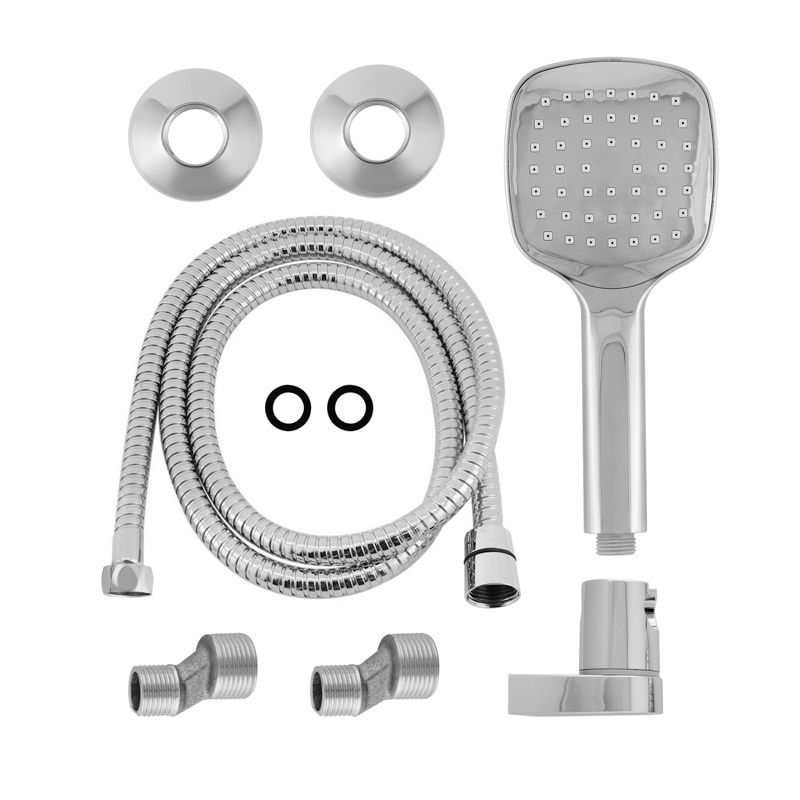 Комплектация: смеситель, металлизированный шланг для душа 1.5 м, душевая лейка 1 режим , пластиковый держатель для лейки, комплект крепежа, эксцентрики, декоративные накладки, паспорт изделия.
