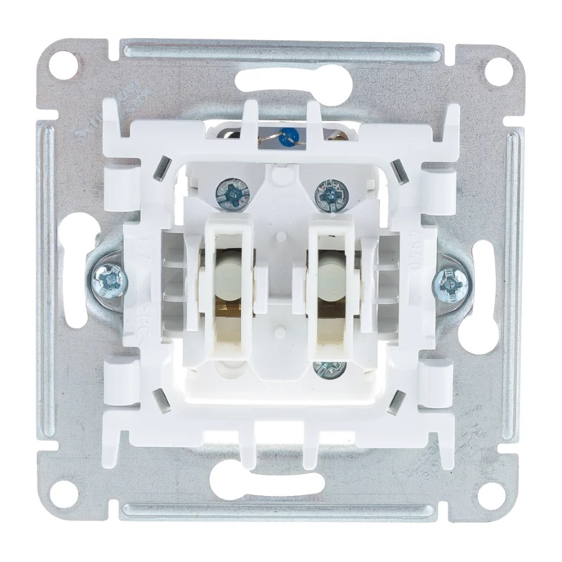 Предназначен для установки в стандартную коробку скрытого монтажа. Без рамки. Светодиодная подсветка синего цвета. Позволяет управлять двумя источниками света с одной точки. Лицевые детали из качественного ABS-пластика, устойчивого к царапинам и УФ-излучению. Покрытие Soft touch. Усиленные прямые монтажные лапки для лучшей фиксации механизма в монтажной коробке.